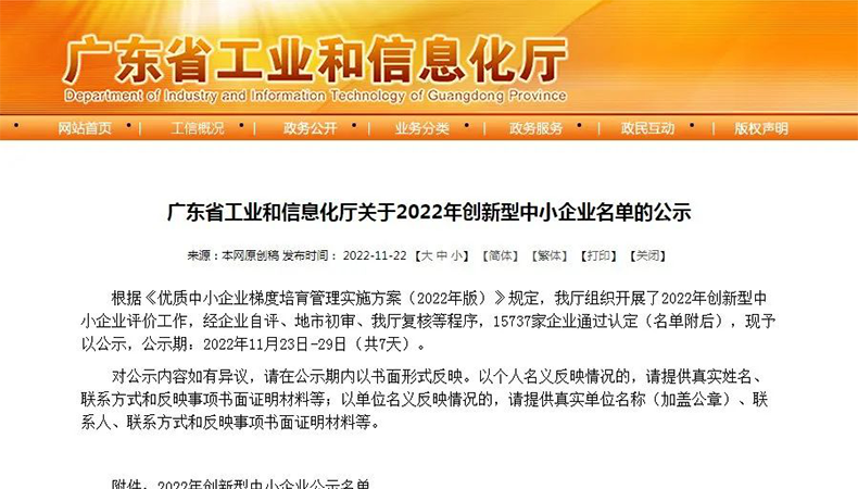 榮冠公司榮獲廣東省“2022年創(chuàng)新型中小企業(yè)”認定!